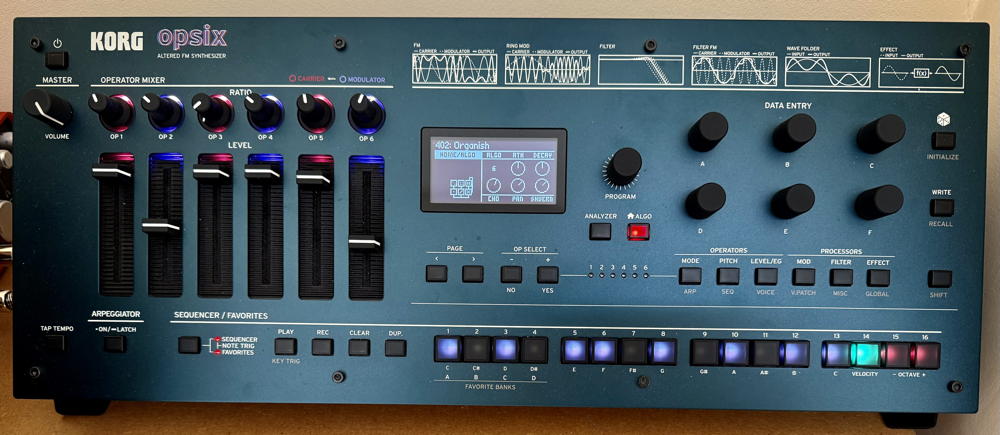 Korg Opsix FM (Frequency Modulation) is a notoriously difficult synthesis technique and the Opsix is Korg's attempt to make it more manageable. The synth goes well beyond 'standard' FM with six operators having multiple modes, three auxiliary envelopes and LFOs, three effects slots with a wide range of options, and a large bank of mod slots. The interface works really well with a module selection and six encoders that avoid the need for menu diving but it's the six ratio & level controls that make the most difference, allowing 'sweet spots' to be (fairly) easily found. The sounds are rich, varied, & interesting and although I still tend to 'discover' rather than 'craft' tones I'm getting a much better feel for FM in action. |