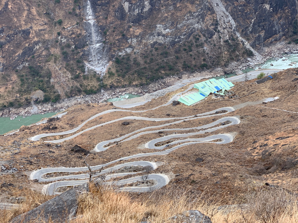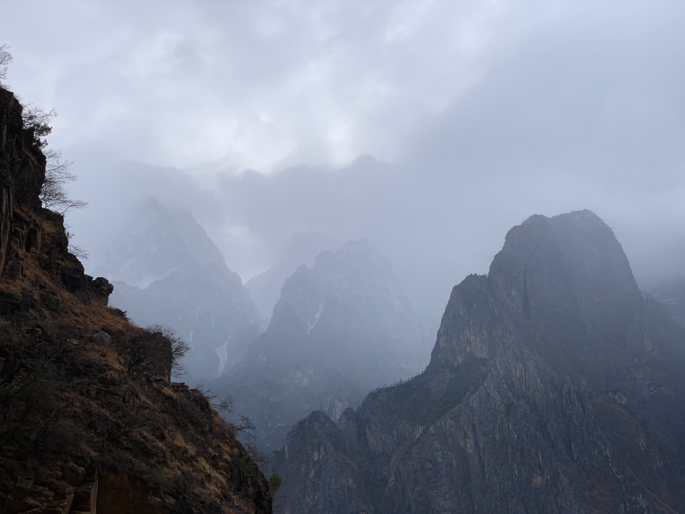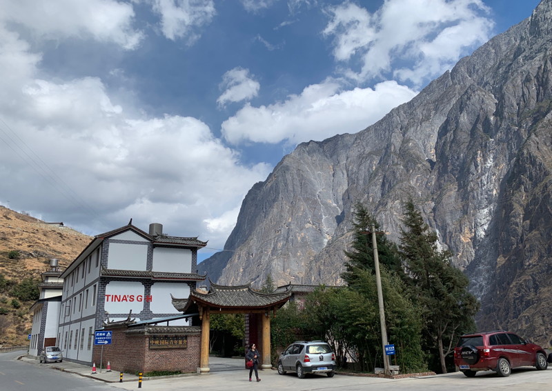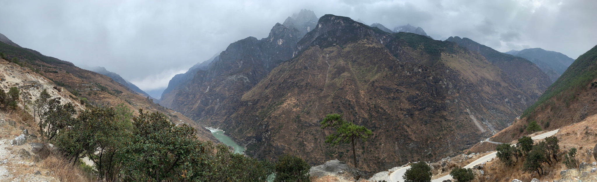 As we drove from Lijiang the weather turned grey with intermittent drizzle which was a bit disappointing, our schedule was for a day of mountain walking and the prospect of doing so wrapped in waterproofs was a bit of a downer. Luckily the rain never made it to the gorge itself. The mountains on either side grew taller & closer, the normally dense tree cover thinned to bare rock, and the road narrowed & became twisty as we approached and entered the gorge, which was as spectacular as the brochure had promised. With peaks vanishing into the cloud cover and the pale green river far below we made our way towards the first of our guesthouse stops.