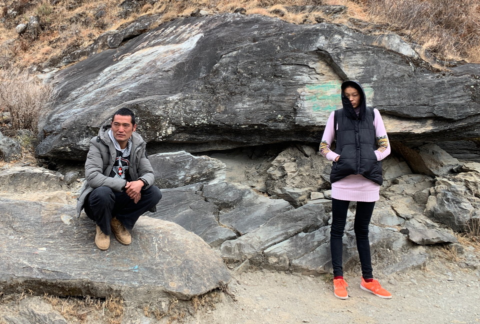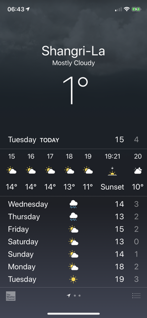 Next morning it was still cold & grey but thankfully dry. A quick check of the weather app on my phone made me smile when it revealed that my location was Shangri-La, had I reached a lost horizon? Breakfast consisted of chocolate & banana pancakes (options were very limited) and coffee, after which we were introduced to our local guide for the hike and his wife, who'd be coming along too. Wearing brightly coloured trainers it was clear that she didn't consider this a demanding, cross-country challenge, which was quite reassuring to some in the group.