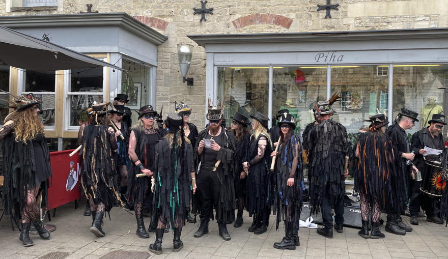 In the middle of May Bradford on Avon had its first (at least since I've lived here) Green Man Festival. Folk dancers & musicians - predominantly Morris dancers but there were styles from all over the UK, Europe & beyond - performed at venues all through the town along with a Hobby Horse procession and St George & the dragon/devil parade. A wonderful reemergence of old traditions but with a definite contemporary flavour - several of the Morris groups looked decidedly punk or goth. It reminded me of the 'Tribal' belly dance stylings I'd seen in New Zealand a few years ago, a funky mix of old & new.