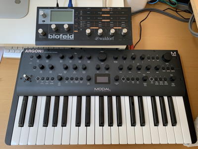 As my career path took some unexpected setbacks & diversions I found myself ironically less hesitant to spend money to extend my equipment list. First came a Modal Argon 8 synthesizer, an instrument that was based on similar principles to the Waldorf but with a much easier interface and a much nicer keyboard (up to now I'd been getting by with a simple but functional two-octave external keyboard, the Argon 8 had a hugely better three-octave one). The wider control layout made a big difference to setting up sounds (the Blofeld's was effective but fiddly) and I adopted the practice of creating each new patch from a plain, initialised starting state rather than finding a preset that was close to what I wanted and modifying it until I had something I was happy with.
