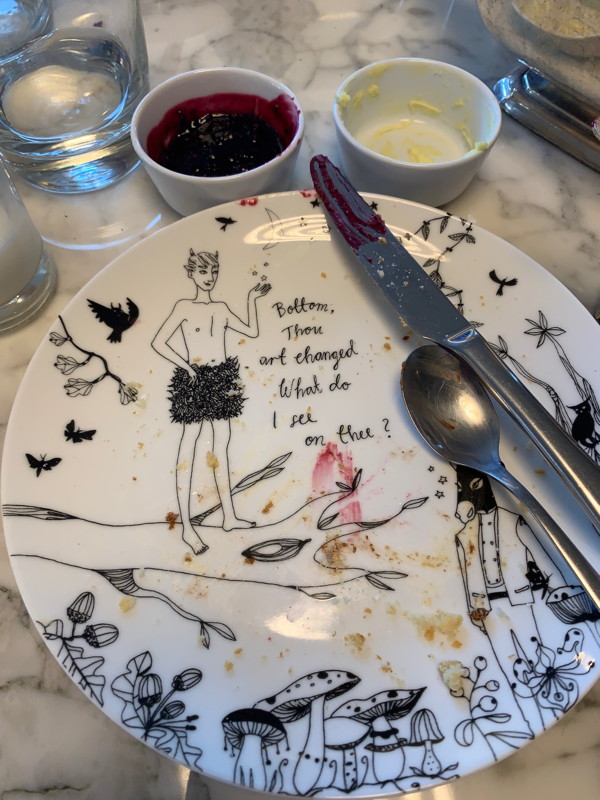 The Shakespearean slant to the meal was, it must be said, not particularly dramatic. The crockery had whimsical drawings & quotes from the play and some of the sandwiches & cakes had unusual flavours but none of it was far outside what you'd expect from a more conventional afternoon tea. Which was probably just as well, a dash of the exotic goes down well but people are unlikely to order an afternoon tea in the expectation of their world being turned on its head. A reflection of our times perhaps - the illusion of variety within very strict & familiar boundaries.