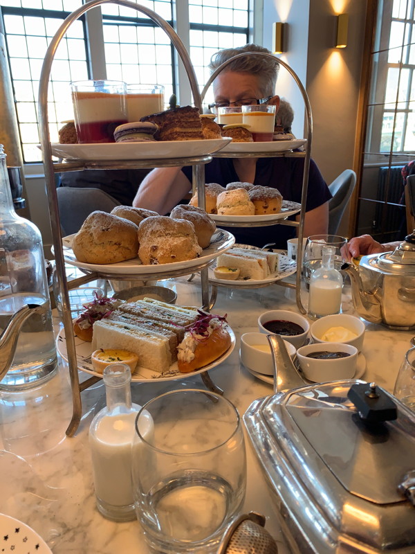 One of the advantages of meeting for afternoon tea is the simplicity of ordering. In most cases the only real choice to be made is what kind of tea to have and this is normally from a fairly short list of options. Most places have vegetarian or meat-free alternatives (I had pre-ordered one to be sure) and everything else is more or less set. A common optional extra is a glass of bubbly to accompany the meal but this is often outrageously expensive - here it was over £10 for a single glass. (At a Birthday Tea in the past we'd gone for the bubbly option but it had come with free (& very frequent) refills which had led to a very animated meal!). Roger decided to try the Gentleman's Tea which featured fewer cakes (and came on a much more manly slab of wood than our effete crockery) but otherwise we all went for the Midsummer Night's Tea to accompany our, er, tea.