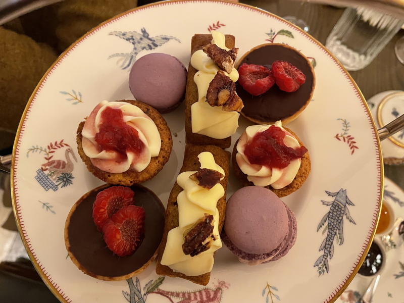 One of the nice things about afternoon tea, and one of the reasons we keep coming back to it, is that there are so few decisions to make when faced with a menu. In most cases it boils down to what type of tea you want and whether to take up the almost inevitable 'glass of champagne' option. This time around it was even simpler, rather than having different choices for vegetarian, gluten-free, etc. we were simply asked for our dietary requirements and the menu was adjusted appropriately. I suggested that the champagne might be a nice addition (there was very little resistance) and soon our table was loaded with champagne flutes, teapots, milk jugs, clotted cream & jam bowls, towers of sandwiches, scones, & cakes, and all the associated crockery & cutlery. And so the feasting began.